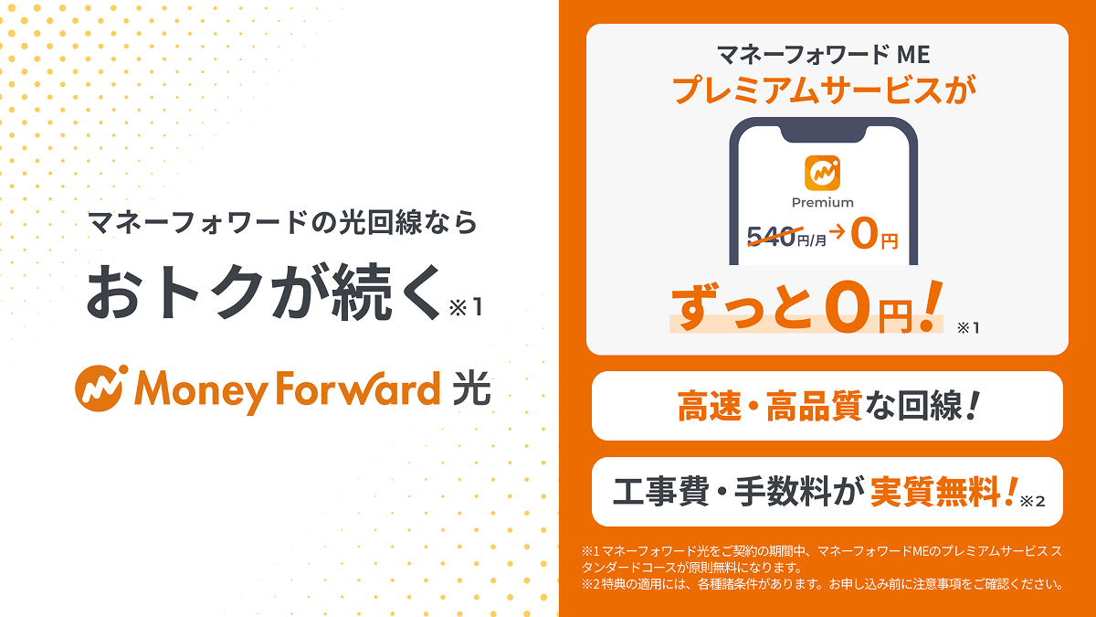 高速・高品質な光回線が、工事費・手数料実質無料で使えます。利用中は『マネーフォワード ME』プレミアムサービスが無料に。
